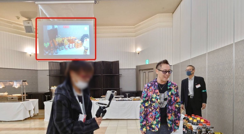 ブース紹介の催しでは、販売者へインタビューし、商品の良さやどんな方へ買ってもらいたいかなどを聞きつつ、それをスマホで撮影した映像を、会場にある3つのスクリーンへリアルタイムに投影したりして、懇親会で楽しんでいる方達にもPRしています。